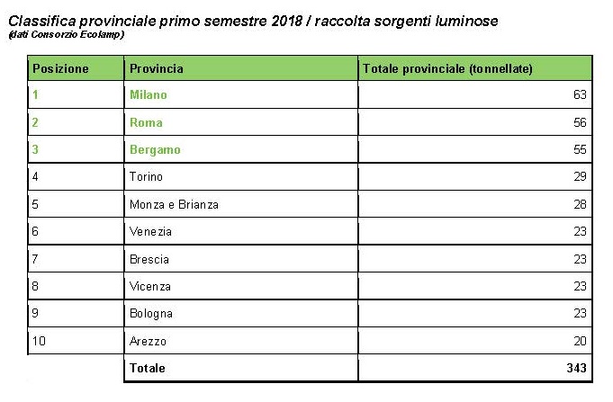 Per quanto riguarda le lampadine – il raggruppamento storico del consorzio – dieci province italiane, di cui quattro lombarde, realizzano insieme il 42% della raccolta, pari a 343 tonnellate di rifiuti di illuminazione avviate a corretto trattamento su un totale di 821. Al primo posto si conferma Milano con 63 tonnellate, seguita sul podio da Roma con 56 e Bergamo con 55. Fa il suo ingresso nella parte alta della classifica Arezzo, unica città toscana, con 20 tonnellate, mentre restano stabili Venezia e Vicenza, rispettivamente con 23,5 e 22,8 tonnellate. Numeri positivi anche per Torino, che raggiunge le 29 tonnellate, e per Bologna che passa da 21 a 23.