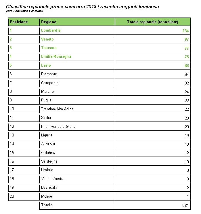 A livello regionale, invece, a trainare la raccolta delle sorgenti luminose si confermano la Lombardia, che passa da 200 a 234 tonnellate, e il Veneto con 97 tonnellate raccolte nel primo semestre, seguito dalla Toscana che, con 77 tonnellate, recupera due posizioni rispetto al 2017. Si confermano, inoltre, tra le prime cinque regioni per la raccolta Ecolamp di sorgenti luminose esauste Emilia Romagna e Lazio, rispettivamente con 75 e 66 tonnellate. A metà classifica il Trentino Alto Adige passa da 18 a 22 tonnellate raccolte e guadagna così il decimo posto. Ottimi risultati anche per Abruzzo, da 9 a 12 tonnellate, Calabria, da 7 a 12 tonnellate, e Valle D’Aosta, che incrementa di oltre una tonnellata la propria raccolta e sfiora i 3mila chili di lampadine conferite.