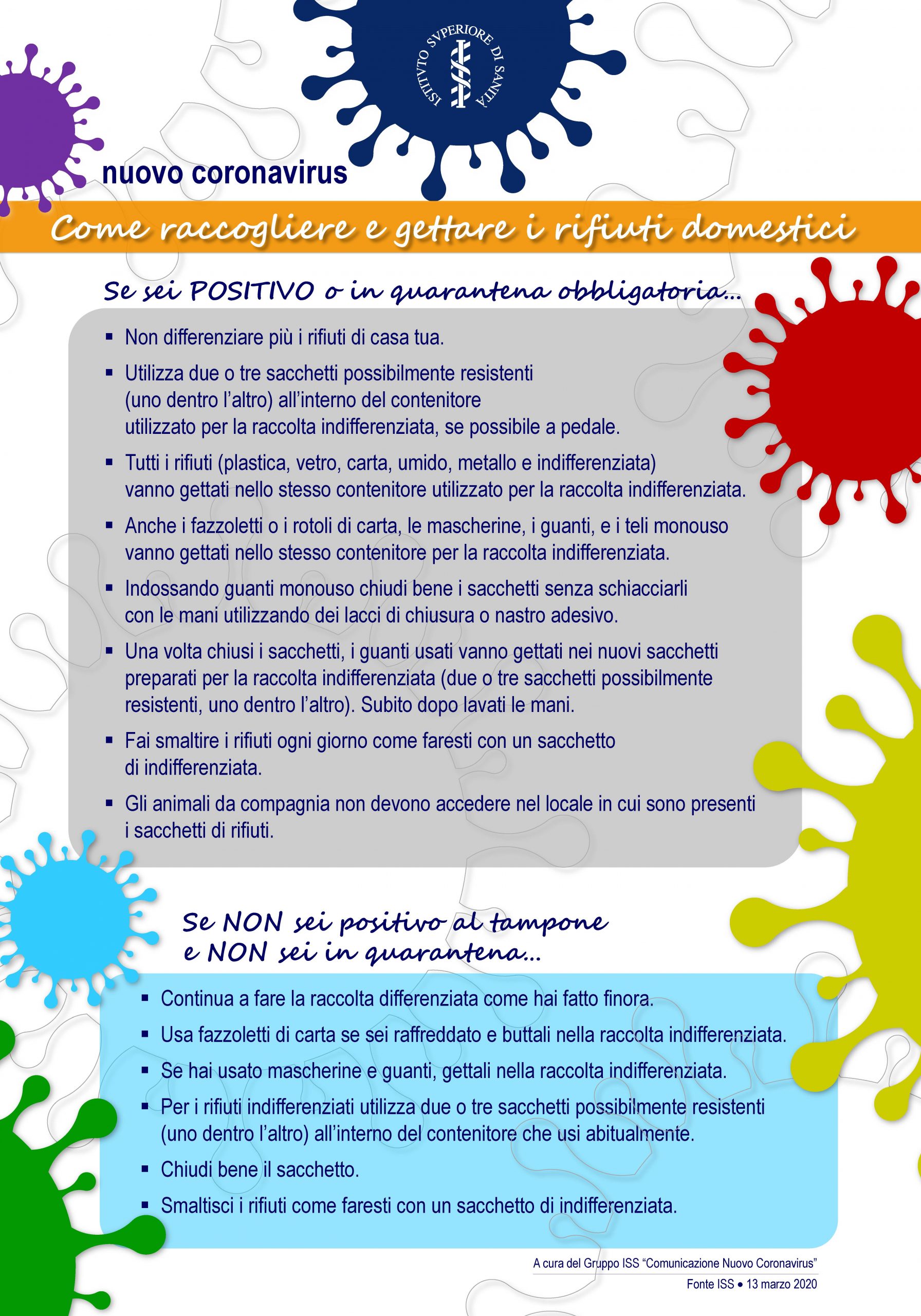L’istituto Superiore di Sanità ha inoltre emesso alcune indicazioni specifiche per la gestione dei rifiuti urbani, distinguendo regole per: