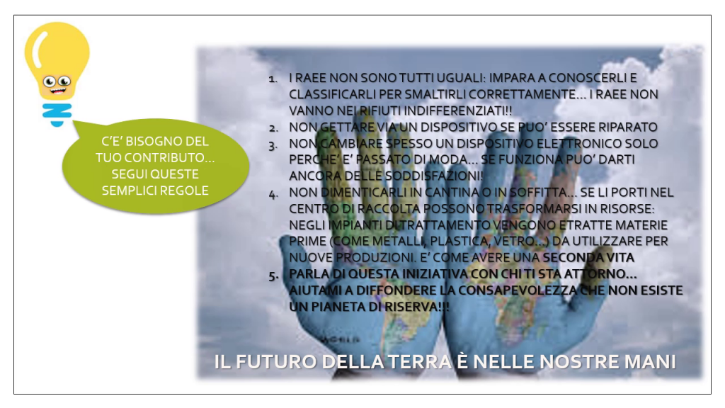 La 3^ A della secondaria di primo grado di Tambre (BL), invece, è riuscita a rendere in maniera efficace e diretta quanto possa essere facile per chiunque fare la raccolta differenziata dei vari rifiuti che di giorno in giorno dobbiamo smaltire, compresi i RAEE.