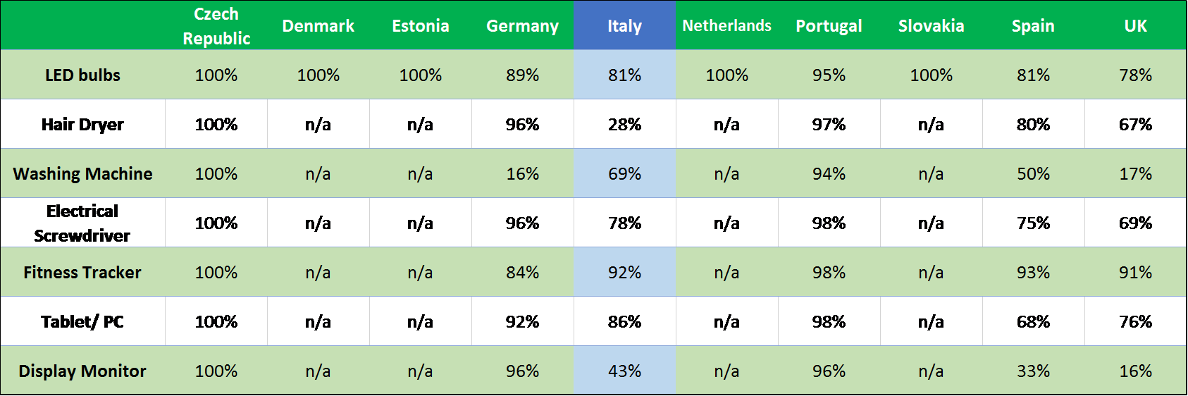 Lo studio, presentato a Bruxelles, condotto da Eucolight su sette diverse tipologie di prodotti (lampadine a LED, asciugacapelli, lavatrici, avvitatori elettrici, orologi fitness, tablet e PC, monitor) venduti attraverso i marketplace in dieci Stati Membri dell’Unione Europea, tra cui l’Italia, ha rilevato che ottantuno offerte sulle prime cento proposte dalla piattaforma sono riferibili a cosiddetti free-rider. Si tratta di venditori non iscritti al Registro nazionale dei produttori di apparecchiature elettriche ed elettroniche ne’ ad un consorzio RAEE, che quindi non dichiarano le quantità immesse sul mercato ne’ partecipano al finanziamento del sistema di gestione dei rifiuti (RAEE) originati dai loro prodotti. Questo di fatto determina un danno economico al sistema di gestione dei RAEE, a spese dei produttori onesti e dei consumatori tutti, e un indebito vantaggio competitivo per soggetti che, non sostenendo i costi di riciclo dei loro rifiuti, possono applicare prezzi più bassi o aumentare i propri margini. Il dato più evidente riguarda i prodotti di piccole dimensioni, come le lampadine a LED, con un tasso di non conformità compresa tra il 78 e il 100 percento. A livello italiano, gli orologi fitness sono in testa alla classifica dei prodotti non conformi con il 92 per cento di produttori non iscritti a registro, seguiti da PC e tablet che raggiungono l’86 percento.