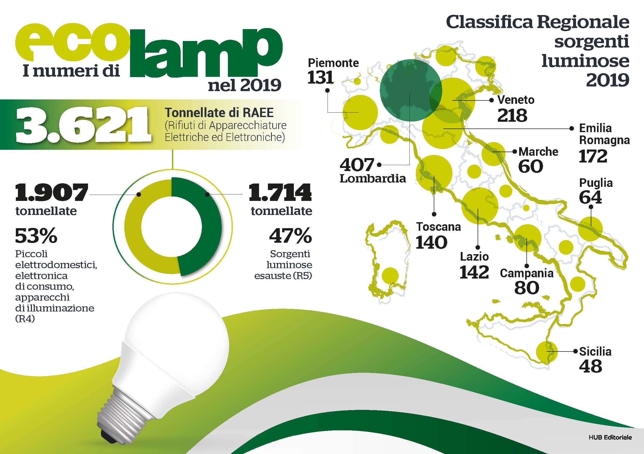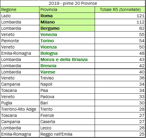 Sono cinque le regioni italiane a trainare il 63% della raccolta di lampadine, per un totale di 1.080 tonnellate gestite dal consorzio Ecolamp. Al primo posto si conferma, anche per il 2019, la Lombardia con 407 tonnellate di sorgenti luminose esauste raccolte, seguita da Veneto (218), Emilia Romagna (172), Lazio (142) e Toscana (140). Per quanto riguarda le province, il podio va quest’anno a Roma con 121 tonnellate, seguita da Milano (112) e Bergamo (82) che totalizzano insieme il 18% della raccolta complessiva di lampadine del consorzio. Dati positivi per Varese, che entra quest’anno nella top ten delle province con 40 tonnellate, e per Napoli, che si conferma prima tra le province del Sud Italia, con 34 tonnellate raccolte.