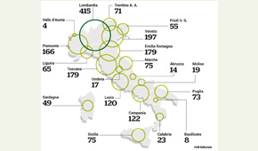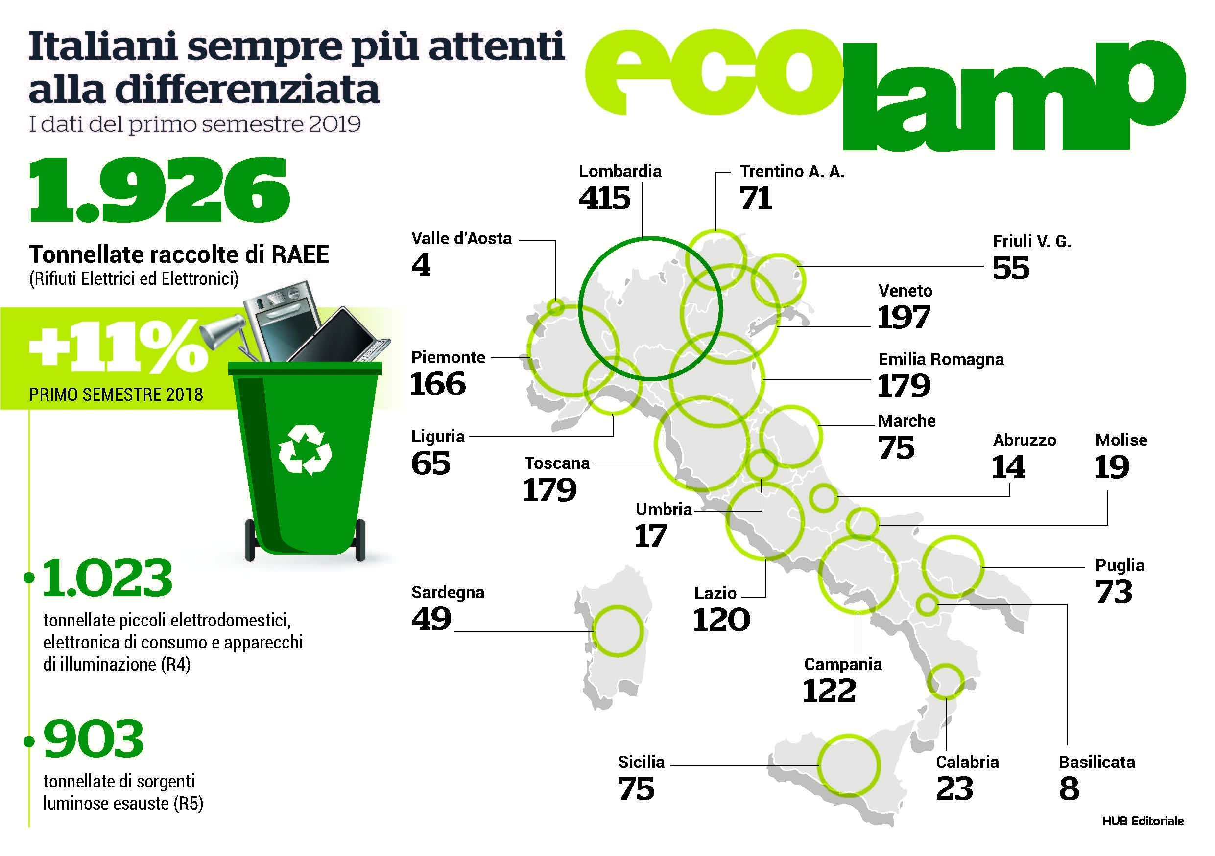 Nei primi sei mesi del 2019 il 50% della raccolta Ecolamp è stata trainata da cinque regioni. Si tratta di Lombardia (415), Veneto (197), Toscana (179), Emilia-Romagna (179) e Piemonte (166), dove il consorzio ha riciclato complessivamente 1.136 tonnellate di rifiuti elettrici ed elettronici. Numeri positivi sono stati registrati anche in Campania che, con 122 tonnellate, si classifica subito dopo il Lazio, al sesto posto, e prima tra le regioni del Sud, seguita dalla Sicilia, con 75 tonnellate.