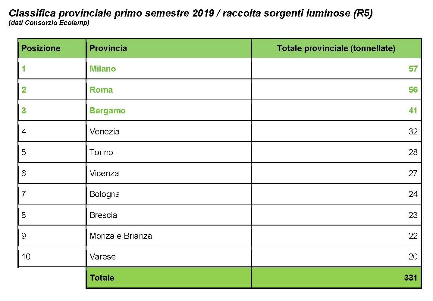 A livello provinciale, più di un terzo della raccolta (37%) di sorgenti luminose esauste, 330 tonnellate, è stato registrato da sole dieci province. Sul podio si confermano, anche per questo semestre, Milano con 57 tonnellate, Roma con 56 e Bergamo con 41. Venezia sale alla quarta posizione passando da 27 a 32 tonnellate, seguita da Torino con 28, Vicenza con 27 e Bologna con 24. Scendono di qualche posizione Brescia (23) e Monza e Brianza (22), mentre mantiene il decimo posto Varese con 20 tonnellate.